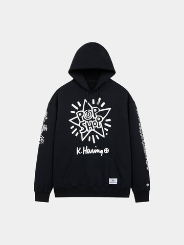 The KEITH HARING X ALPHA NEW YORK GRAPHIC HOODIE features prints of iconic Keith Haring designs down both arms, and a large ""Pop Shop"" graphic on the front. This design was the logo for the original Pop Shop On the back is a large print of Haring's ""New York"" design. Haring originally created a version of this artwork for David Dinkins’ 1989 New York mayoral run. Dinkins was NYC’s first and only black mayor.