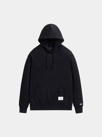 A basic, unisex hoodie with Alpha Industries logo on the sleeve.